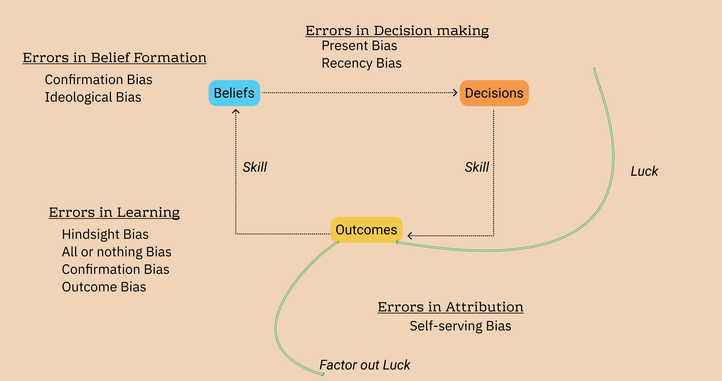 The Decision Loop outlines the life-cycle of a decision. Most decisions start from beliefs we hold – both about the state of the world, and about the effects of our actions on the world. These beliefs influence our decisions to act on the world in one way or another. However, the outcomes from our actions are also influenced by luck, in addition to the skillful action we took. Outcomes, in other words are a signal with some noise embedded. To learn from outcomes we need to first tell apart the signal from the noise, and then update our priors in the light of this signal. After this updating, we're ready for our next round of decisions. 'Thinking in Bets' discusses what can go wrong in each step of this cycle.